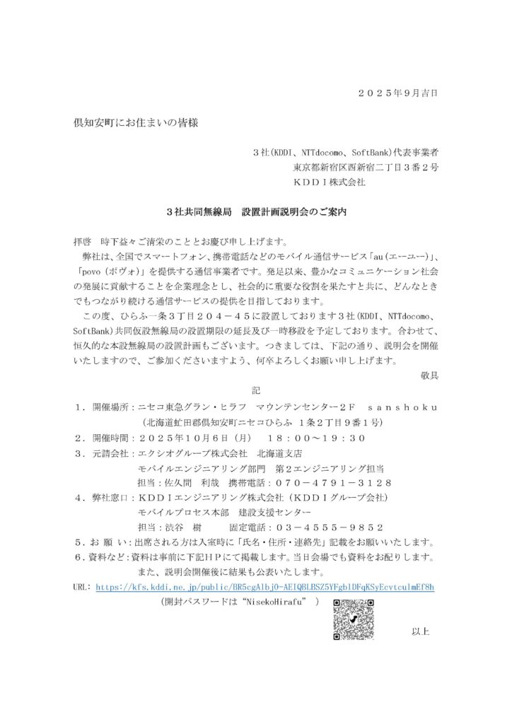 KDDI、NTTドコモ、ソフトバンク3社による携帯電話基地局の設置計画説明会が開催されます。ひらふエリアの通信環境向上に関わる重要な内容となっております。